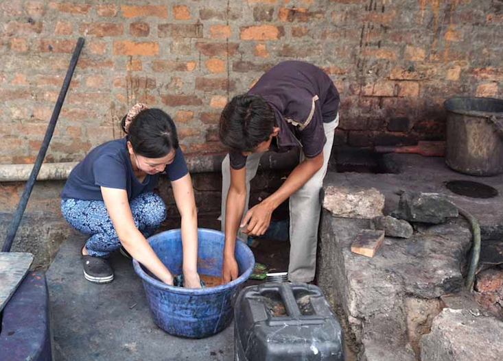 ブロックを押す際、布にしっかりペーストを染み込ませるため、力強く叩きます。