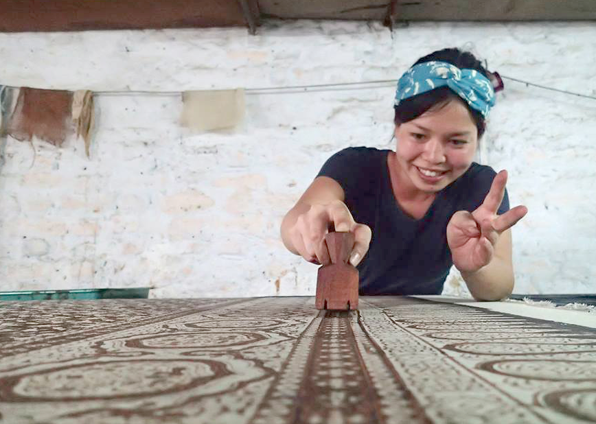 ブロックプリントとは、模様が彫られた木版で、ペーストをハンコのように布にプリントする染色技法です。