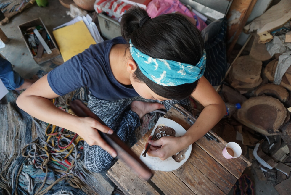 デザインが決まったら、それを木の表面に写して、彫り始めます